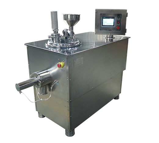 本機用于制藥工業(yè)中的固體制劑生產,集傳統制粒工藝中的混合和制粒兩道工序與一體同時進行,其制粒過程是先把粉料投入料筒內經攪拌漿形成翻滾狀態(tài),使不同性質的粉料得到徹底的混合,然后逐量加入粘合劑。(通過攪拌漿和筒壁對物料的擠壓、揉合,使其形成潮濕均勻的軟材,同時經制粒刀片的高速切割,逐步形成大小均勻的顆粒,最后由出料口排出,顆粒目數的大小由制粒刀的轉速和制粒時間控制)。